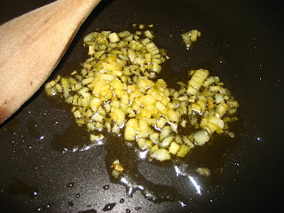 6. In the meantime, in a skillet on low, saute some minced garlic in 2-3 TBS of olive oil. Keep the heat on low so as not to burn. You want a mellow garlic. This step was my version so you can skip it if you want.