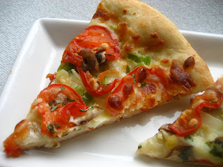 America's Test Kitchen Pizza Crust...This version of Pizza Margherita comes from America's Test Kitchen Baking cookbook. I shouldn't really call it Pizza Margherita because, I added some thinly sliced mushrooms, some thinly sliced onion and some chopped bell peppers. But , you can do a classical one by sticking to only cheese, tomato and basil. I have to admit that I changed a few things. Ok, I just used the dough recipe and added my own toppings:) ...