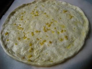 12. Lightly brush the dough with the oil and garlic. Keep the garlic in the inner circle of the dough trying not to put any garlic on the rim of the pizza dough~ so as not to burn the garlic in the oven.