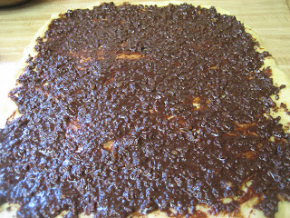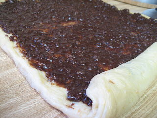 9. Roll one part into a large rectangle( 11x14 approximate) and spread nut filling to within 1/2 inch of the edge.