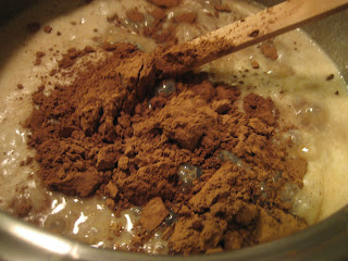 3. Add cocoa and flavorings. Cook some more to the point that the filling is paste-like. (I think that if the filling is too wet it can cause quite a bit if steam in the final baking stage...causing the cozonac to fall).