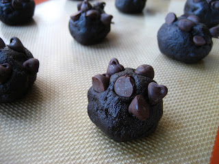 4. Drop by rounded tablespoonfuls onto parchment lined cookie sheets. I usually roll the dough in my hands to form a ball. Place some nuts or chocolate chips on top of the rounded cookie dough, slightly pushing them in the dough. This way they won't fall off when baked.